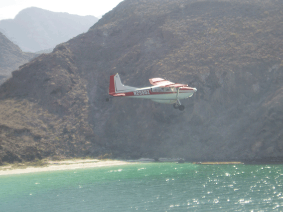 8th day. Were burning these vacation days fast, time to see more of Baja, plus were pilots, let's shake the dust of these aircraft and get flying. Loreto for a quick fuel stop, we thought. Remember Punta Penasco and the form they didn't have and we didn't need, we needed it! 3 hours later with phone and fax's we finely got out of jail and headed south, Punta Colorado. Flying the Baja coast in formation 100' AGL or rather AWL, Above Water Level. Spectacular scenery; scrub brush desert , rugged coastline and deep blue sea The only way you can see it is a week trip by boat or a day by small aircraft. We enjoyed every mile and buzzed every boat, village and burro we saw and there were a few. Before Diana and I go back to Mexico we'll have to paint the C-185 a different color!