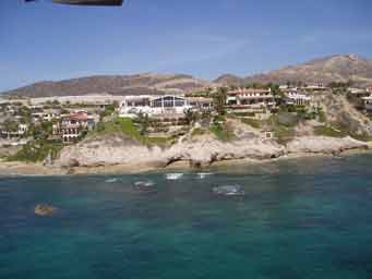 Decisions, decisions... Do we stay or go. I wanted to do some fishing and this is the place but Pat had a friend in Mulege to take us. We opt for one night in Punta Colorado. 9th day mid morning, we're once again low level along the beach towards Cabo San Lucas. The evidence of money is scattered at first then as we approach Cabo it's a constant parade of million dollar homes perched on every rock or splayed on the beach, then the hotels and crowded beaches as Pat and I maneuver around the parasails, rounding the Tip of Baja. One minute we're enjoying the placid waters and light surf on the Sea of Cortez then we turn the corner into 25 knot north west wind, pounding Pacific surf with a 20° drop, it's like we were transported to the San Francisco coast. I even had to turn the heat on. Flying low level eats up fuel and with the Pacific winds giving us a rough ride we climb up and set course for Loreto and lunch.
