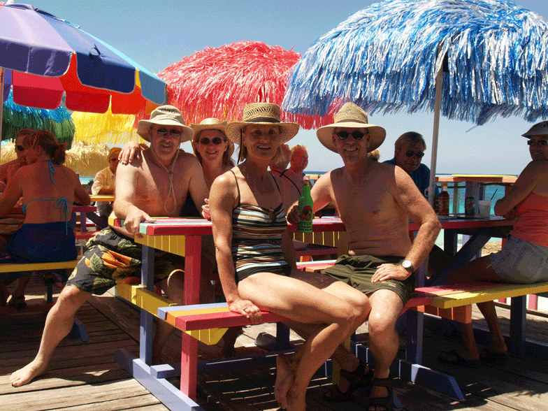 April 21st. & 22nd Airborne from Lakeland by 10:30 and off to the Bahamas! First stop, the Bimini Islands. Just a mere 35 minutes of flying across water.....60 miles out from the Florida coast. We land at South Bimini, clear customs and catch a taxi to the water taxi dock. Then onto the water taxi and over to North Bimini. We find Blue Water Resort and check in. Two rooms on the west side of the island. But, the wind is still with us and snorkeling seems out of the question for now. Wandering around town in our rented golf cart offers lots of amusing time for all. Dinner that night at Sara's End of the Road Restaurant, fun place. While in Bimini we tried raw conch and cooked conch.....interesting raw, but much better cooked. A bit of beach walking and swimming...and a lot of visits to local watering holes.