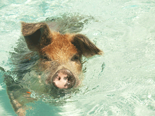 More to see though, someone suggest finding local wildlife and we did, pigs and not just any but swimming pigs as it turned out. As we headed towards a beach these porkers came out to greet us, except they expected a snack and when we didn't have one they attempted a boarding. It was close till we got the outboard in gear and repelled the borders. Continuing our exploring we were on a quest for an out of the way Cay and lunch at a local marina. We found it and as were motoring in we notice large shadowy shapes. It isn't till we dock we see them move, sharks, 5' to 8' Nurse Sharks. Were not swimming here!