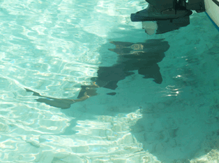 Diana and Kim Thunder Ball Grotto Repelling borders Shark under our boat