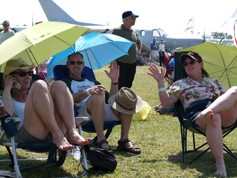 April 20th. More time spent checking out the exhibitor booths, new and old airplanes. On Friday night they have a night time air show. None of us had seen one of those before. It was fantastic! Formation flying and some limited aerobatics. Lots of lights! The evening was capped off with a great fireworks show. Diana hasn't seen fireworks in the summer at night for 31 years!