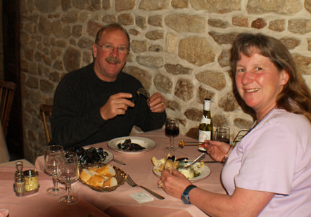 We made our way to the hotel Le Croix Blanche and checked in. Our hotel offered 9 rooms. A mere 4 floors up to our room, each floor alternating between 20 and 15 steps to the next set in a wooden and iron spiraling staircase. Really wondered if the ol' ticker would make numerous trips! Alas...still here to report.